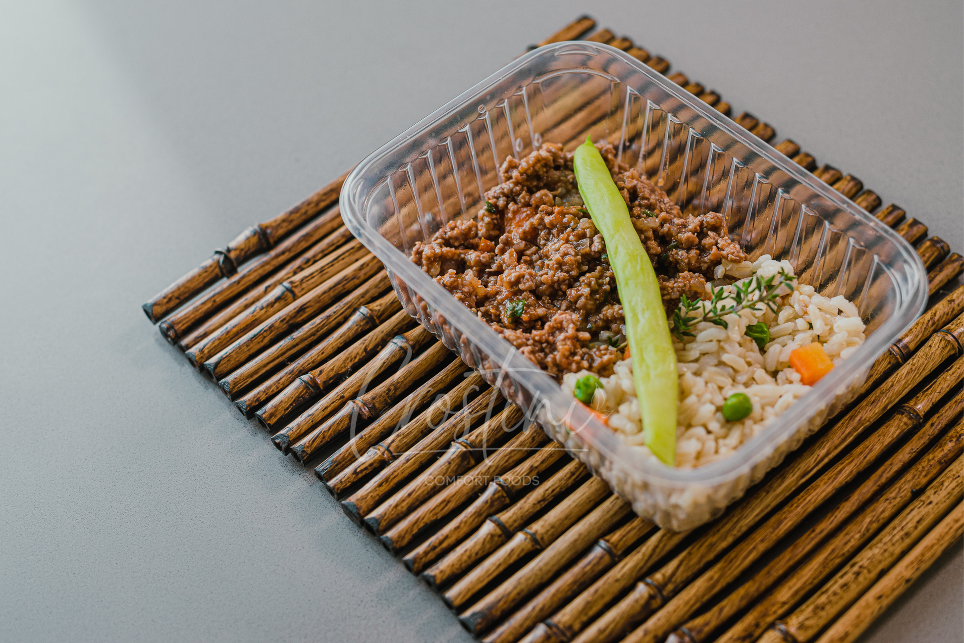 Carne moída de patinho, cebola, alho, manjericão, vinho malbec, vagem, arroz integral, ervilhas frescas e cenoura.