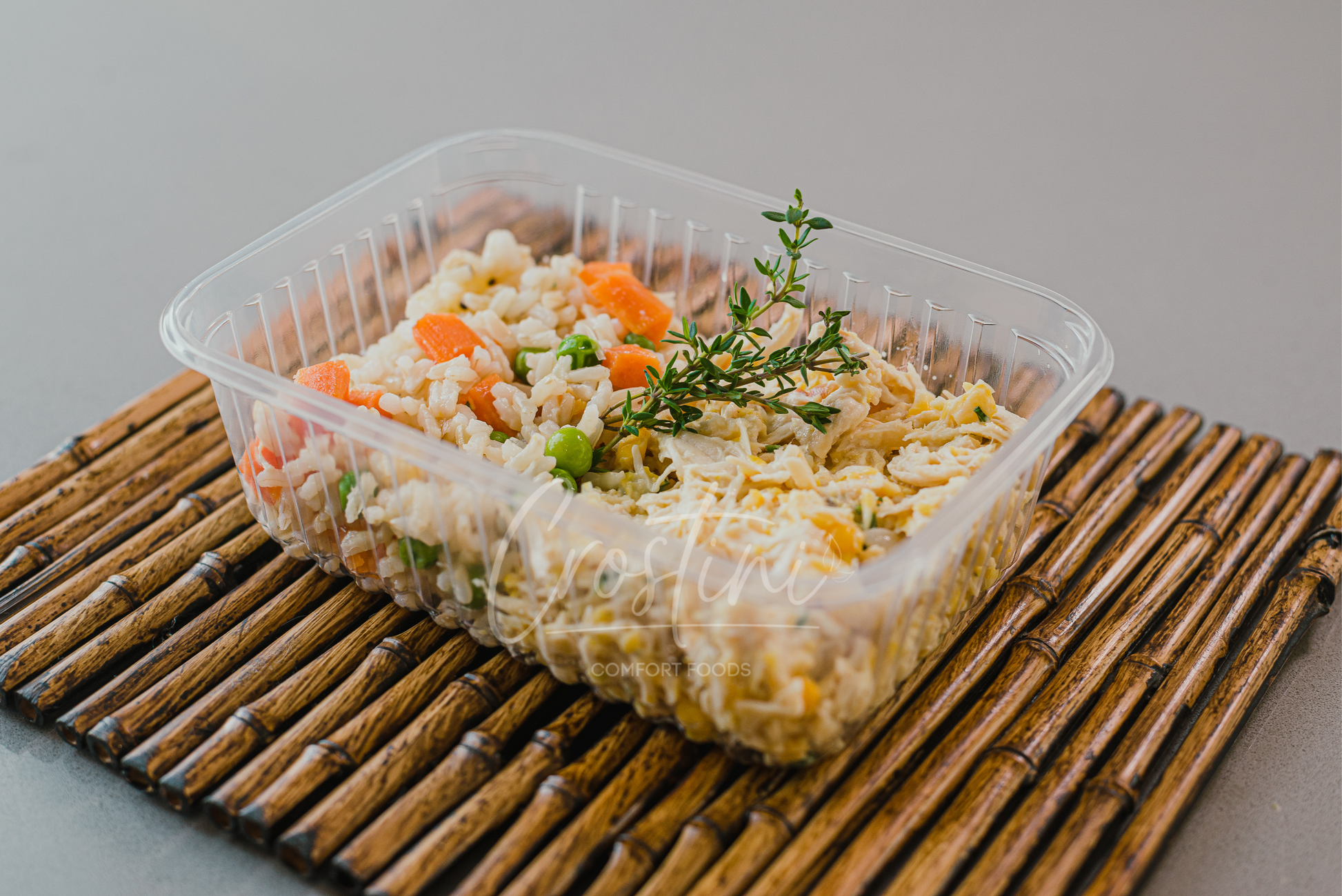 Peito de frango desfiado, creme de milho, cebola, alho, tomilho, arroz integral, ervilhas frescas e cenoura.