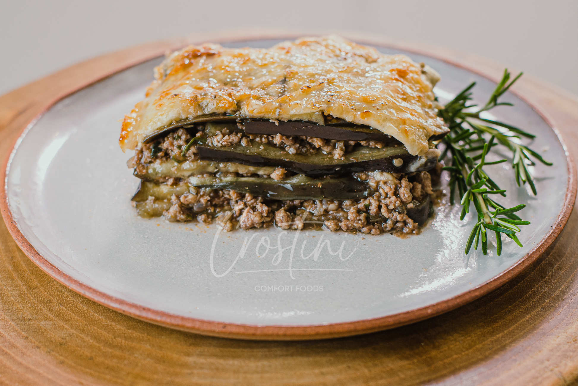 Carne de patinho moída, cebola, alho, alecrim, mix de tomates, molho pomodoro, manjericão, queijo mussarela, leite, farinha de trigo, manteiga e berinjelas.