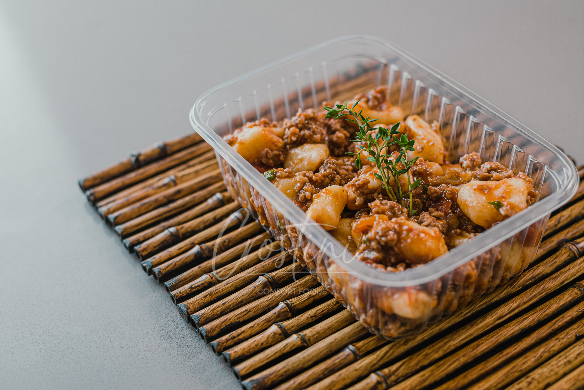 Batata inglesa, farinha de trigo, ovo, carne moída de patinho, caldo de carne, cebola, alho, alecrim, manjericão e molho pomodoro.