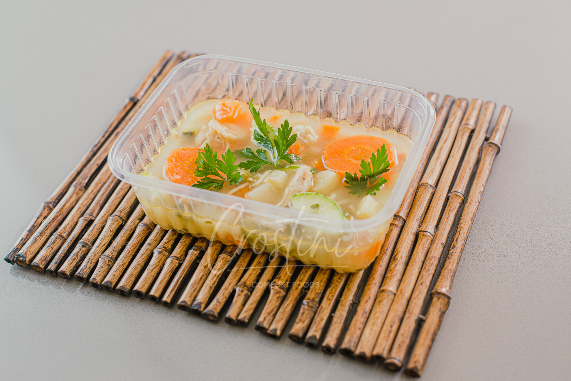 Batata inglesa, abobrinha, cenoura, alho-poró, caldo de legumes, cebola, alho, salsinha e cubos de frango.